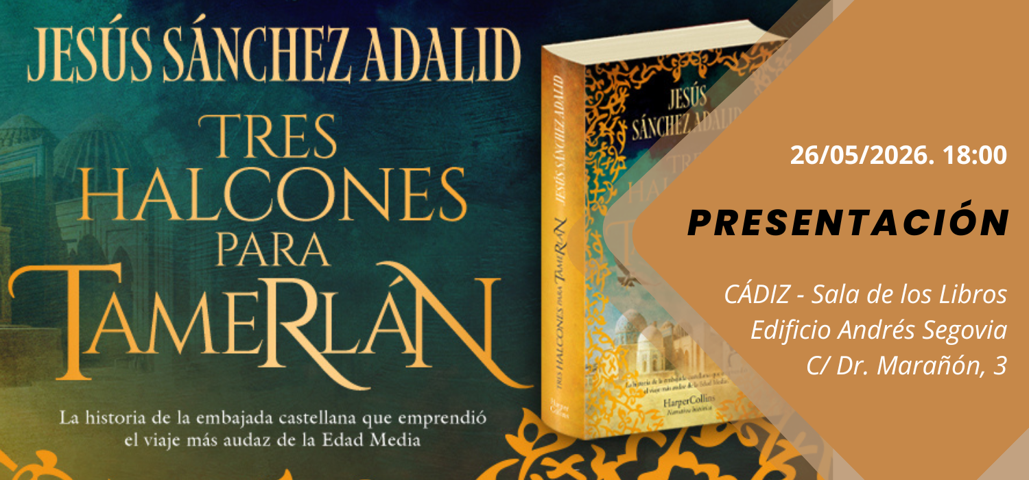 | Presentación de la novela “Tres halcones para Tamerlán” a cargo de su autor, Jesús Sánchez Adalid | evento | 24/04/2026 | 26 mayo 2026 | Fecha, lugar, modalidad e idioma Martes, 26/05/2026, 18:00 horas Sala de los Libros, Edificio Andrés Segovia (calle Dr. Marañón, 3, Cádiz)... |